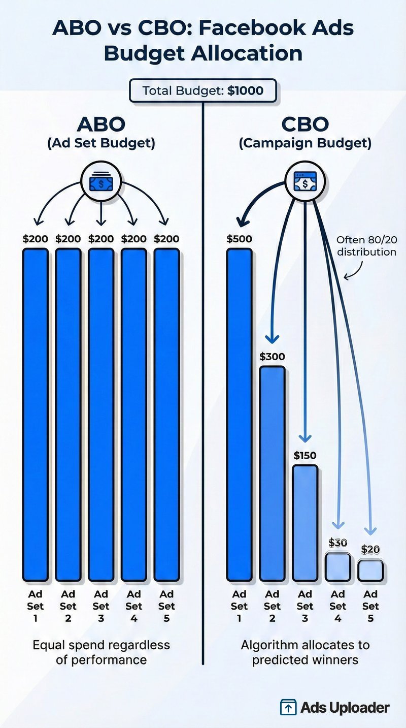 ABO means setting your budget at the ad set level rather than the campaign level. Each ad set gets exactly what you allocate, regardless of performance.