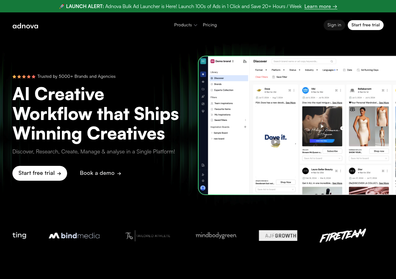 Overview: Adnova started as a creative analytics platform and added bulk launching to compete in this space. If you want creative research and competitor tracking bundled together, it offers that combination. Just understand the launcher isn't their original core focus.
