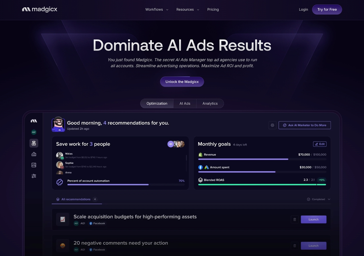 Overview: Madgicx is an "E-commerce Ad Cloud" that includes bulk launching as one of many features. If you want AI-driven optimization and comprehensive analytics, and bulk launching is just one need among many, it may fit. But if you're looking for a focused bulk launcher, you're paying for a lot more than you need.